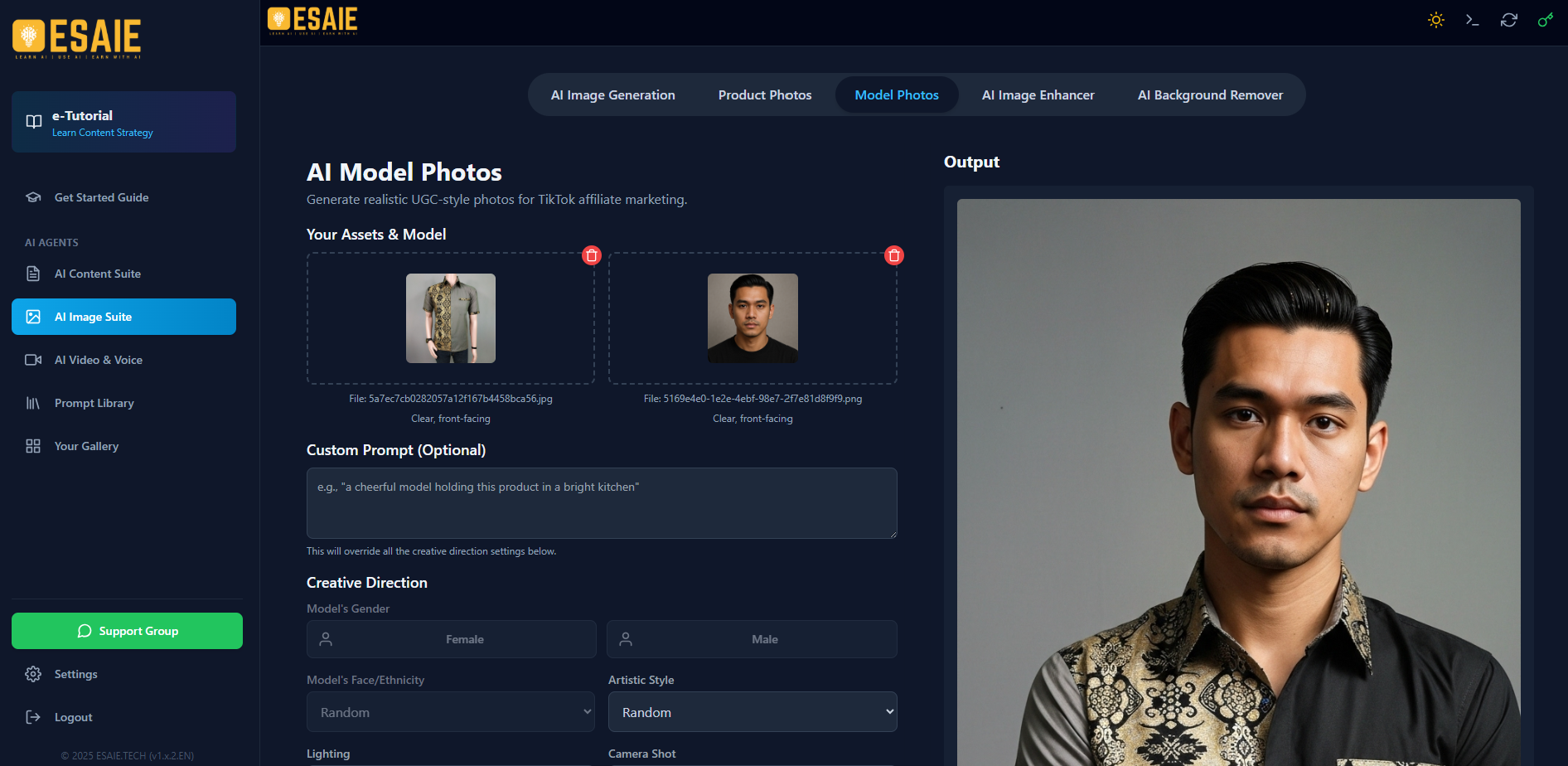 Hanya dengan memuat naik satu gambar produk, ESAIE mampu menjana puluhan variasi konten UGC berkualiti tinggi dalam masa beberapa minit. Setiap hasil dipadankan dengan prinsip pemasaran visual dan algoritma semasa untuk meningkatkan visibility, meningkatkan engagement dan mempercepatkan pertumbuhan jualan di platform seperti TikTok, Instagram dan lain-lain.